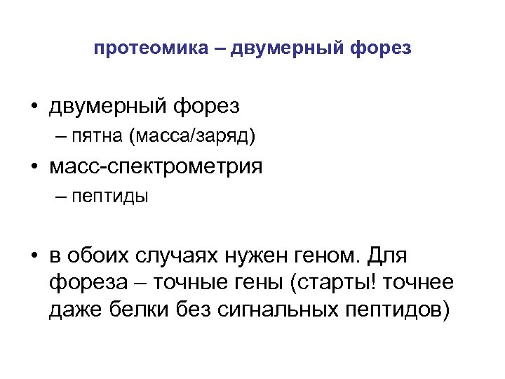 протеомика – двумерный форез • двумерный форез – пятна (масса/заряд) • масс-спектрометрия – пептиды • в обоих случаях нужен геном. Для фореза – точные гены (старты! точнее даже белки без сигнальных пептидов)