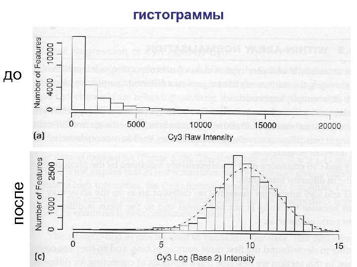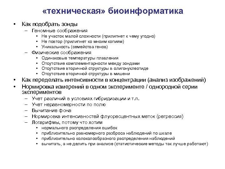 «техническая» биоинформатика • Как подобрать зонды – Геномные соображения • Не участок малой сложности (прилипнет к чему угодно) • Не повтор (прилипнет ко мноим копиям) • Уникальность (семейства генов) – Физические соображения • • • Одинаковые температуры плавления Отсутствие комплементарности между зондами Отсутствие вторичной структуры в олигонуклеотиде Отсутствие вторичной структуры в мишени Как переделать интенсивности в концентрации (анализ изображений) Нормировка измерений в одном эксперименте / однородной серии экспериментов – – – Учет различий в условиях гибридизации и т. п. Учет неравномерности по полю Вычитание фона Нормировка интенсивностей флуоресцентных меток (регрессия) Логарифмы, потому что хотим • • нормального распределения ошибок приблизительно равномерного разброса наблюдений по шкале приблизительно колообразного распределения наблюдений вычитать, а не делить при анализе (статистические методы так лучше работают)