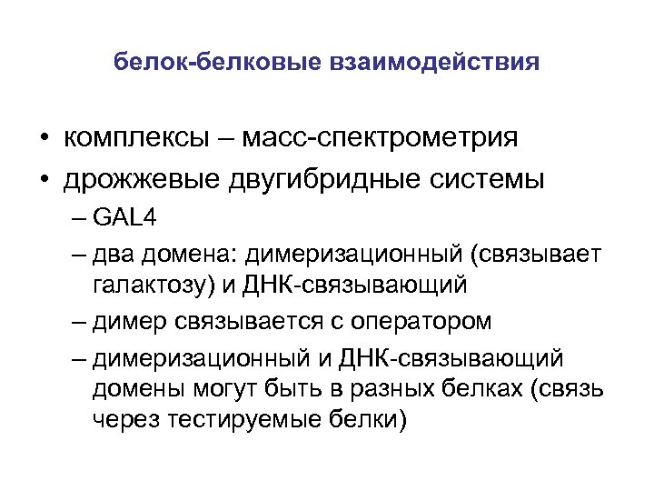 белок-белковые взаимодействия • комплексы – масс-спектрометрия • дрожжевые двугибридные системы – GAL 4 – два домена: димеризационный (связывает галактозу) и ДНК-связывающий – димер связывается с оператором – димеризационный и ДНК-связывающий домены могут быть в разных белках (связь через тестируемые белки)
