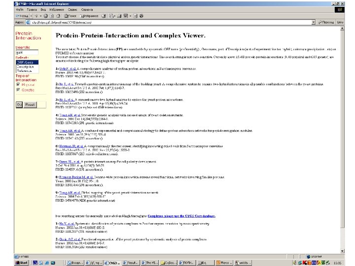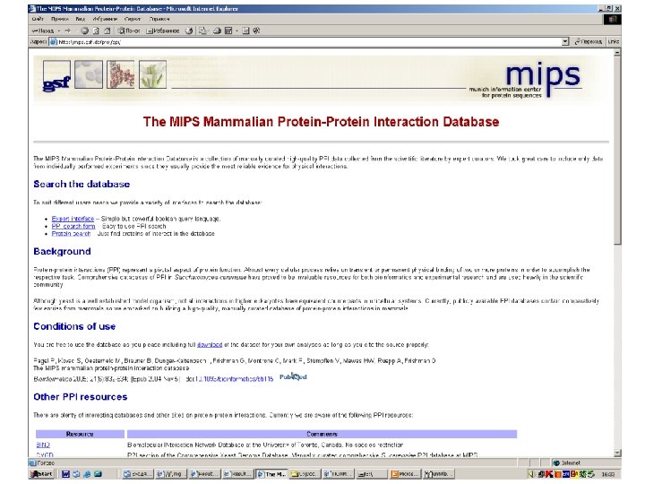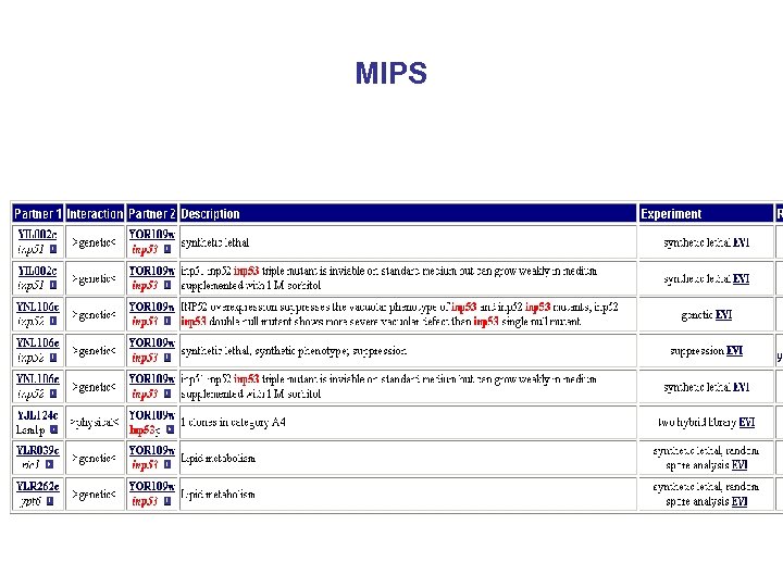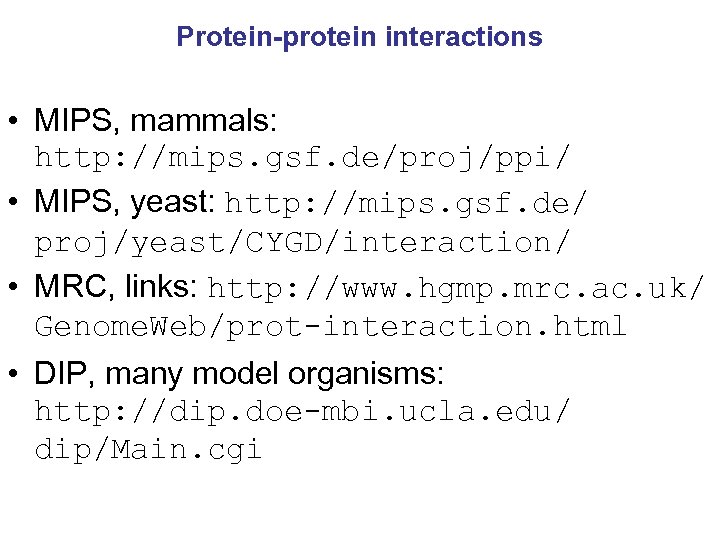 Protein-protein interactions • MIPS, mammals: http: //mips. gsf. de/proj/ppi/ • MIPS, yeast: http: //mips. gsf. de/ proj/yeast/CYGD/interaction/ • MRC, links: http: //www. hgmp. mrc. ac. uk/ Genome. Web/prot-interaction. html • DIP, many model organisms: http: //dip. doe-mbi. ucla. edu/ dip/Main. cgi