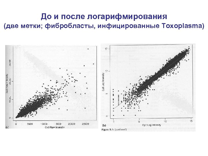 До и после логарифмирования (две метки; фибробласты, инфицированные Toxoplasma)