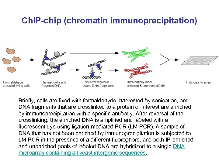 Ch. IP-chip (chromatin immunoprecipitation) Briefly, cells are fixed with formaldehyde, harvested by sonication, and DNA fragments that are crosslinked to a protein of interest are enriched by immunoprecipitation with a specific antibody. After reversal of the crosslinking, the enriched DNA is amplified and labeled with a fluorescent dye using ligation-mediated PCR (LM-PCR). A sample of DNA that has not been enriched by immunoprecipitation is subjected to LM-PCR in the presence of a different fluorophore, and both IP-enriched and unenriched pools of labeled DNA are hybridized to a single DNA microarray containing all yeast intergenic sequences.