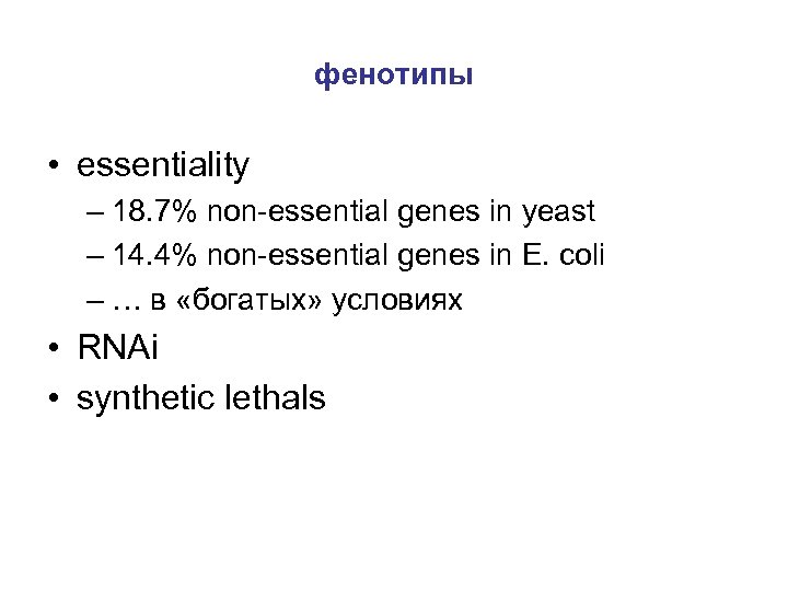 фенотипы • essentiality – 18. 7% non-essential genes in yeast – 14. 4% non-essential genes in E. coli – … в «богатых» условиях • RNAi • synthetic lethals