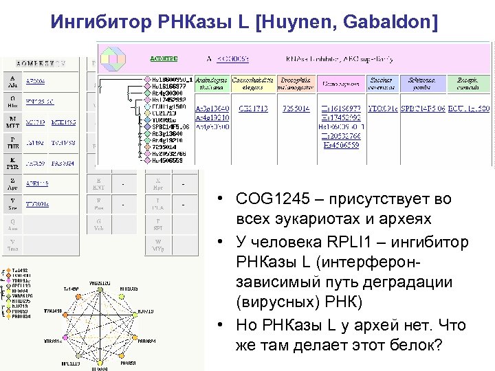 Ингибитор РНКазы L [Huynen, Gabaldon] • COG 1245 – присутствует во всех эукариотах и археях • У человека RPLI 1 – ингибитор РНКазы L (интерферонзависимый путь деградации (вирусных) РНК) • Но РНКазы L у архей нет. Что же там делает этот белок?