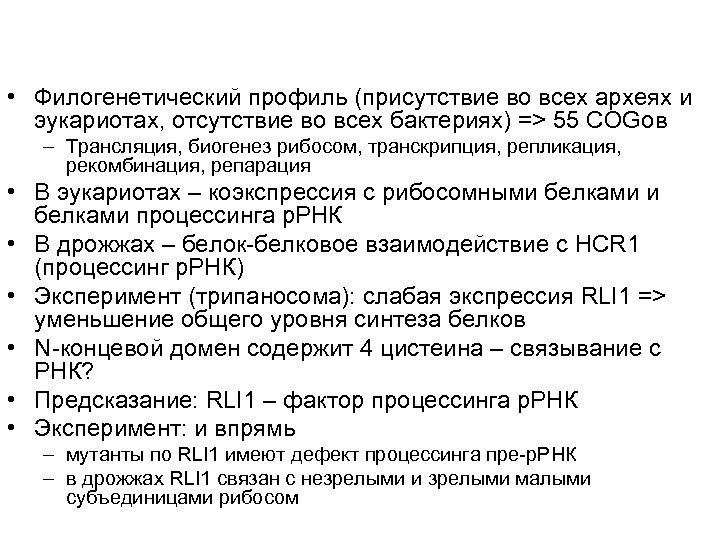 • Филогенетический профиль (присутствие во всех археях и эукариотах, отсутствие во всех бактериях) => 55 COGов – Трансляция, биогенез рибосом, транскрипция, репликация, рекомбинация, репарация • В эукариотах – коэкспрессия с рибосомными белками процессинга р. РНК • В дрожжах – белок-белковое взаимодействие с HCR 1 (процессинг р. РНК) • Эксперимент (трипаносома): слабая экспрессия RLI 1 => уменьшение общего уровня синтеза белков • N-концевой домен содержит 4 цистеина – связывание с РНК? • Предсказание: RLI 1 – фактор процессинга р. РНК • Эксперимент: и впрямь – мутанты по RLI 1 имеют дефект процессинга пре-р. РНК – в дрожжах RLI 1 связан с незрелыми и зрелыми малыми субъединицами рибосом