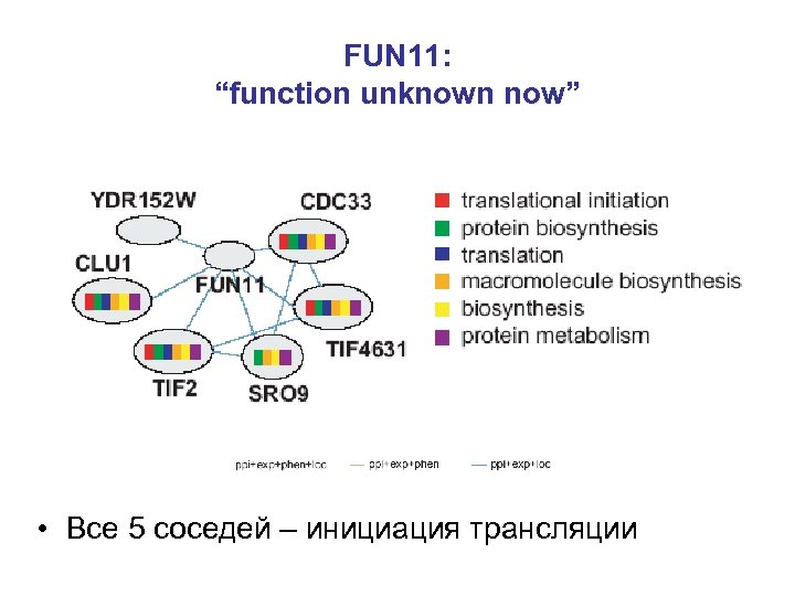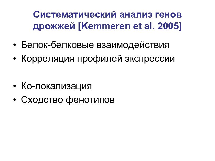 Систематический анализ генов дрожжей [Kemmeren et al. 2005] • Белок-белковые взаимодействия • Корреляция профилей экспрессии • Ко-локализация • Сходство фенотипов