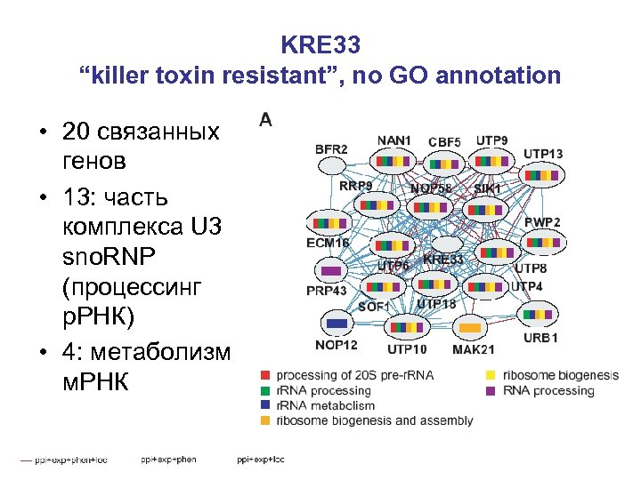 KRE 33 “killer toxin resistant”, no GO annotation • 20 связанных генов • 13: часть комплекса U 3 sno. RNP (процессинг р. РНК) • 4: метаболизм м. РНК