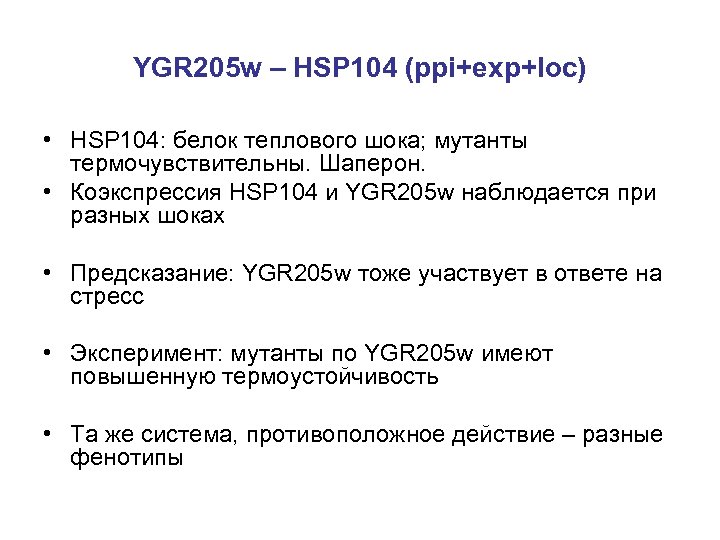 YGR 205 w – HSP 104 (ppi+exp+loc) • HSP 104: белок теплового шока; мутанты термочувствительны. Шаперон. • Коэкспрессия HSP 104 и YGR 205 w наблюдается при разных шоках • Предсказание: YGR 205 w тоже участвует в ответе на стресс • Эксперимент: мутанты по YGR 205 w имеют повышенную термоустойчивость • Та же система, противоположное действие – разные фенотипы