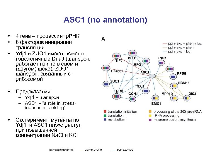 ASC 1 (no annotation) • • 4 гена – процессинг р. РНК 6 факторов инициации трансляции Ydj 1 и ZUO 1 имеют домены, гомологичные Dna. J (шаперон, работает при тепловом и (другом) шоке), ZUO 1 – шаперон, связанный с рибосомой Предсказания: – Ydj 1 – шаперон – ASC 1 – “a role in stressinduced misfolding” • Эксперимент: мутанты по Ydj 1 и ASC 1 плохо растут при повышенной концентрации Na. Cl и KCl