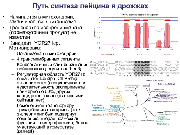 Путь синтеза лейцина в дрожжах • Начинается в митохондрии, заканчивается в цитоплазме • Транспортер изопропилмалата (промежуточный продукт) не известен • Кандидат: YOR 271 cp. Мотивировка: – Локализован в митохондрии – 4 трансмембранных сегмента – Консервативный сайт связывания лейцинового регулятора Leu 3 p – Регуляторная область YOR 271 c связывает Leu 3 p в Ch. IP-chip эксперименте (специфичность и чувствительность эксперимента примерно по 50%, других кандидатов с консервативными сайтами нет) – Гомологичен транспортеру трикарбоксилатов крысы (хотя эксперимент был подвернут сомнению; вторая возможная функция – сидерофлексин, белок, участвующий в гомеостазе железа)