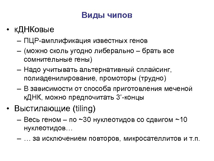 Виды чипов • к. ДНКовые – ПЦР-амплификация известных генов – (можно сколь угодно либерально – брать все сомнительные гены) – Надо учитывать альтернативный сплайсинг, полиаденилирование, промоторы (трудно) – В зависимости от способа приготовления меченой к. ДНК, можно предпочитать 3’-концы • Выстилающие (tiling) – Весь геном – по ~30 нуклеотидов со сдвигом ~10 нуклеотидов… – … за исключением повторов, микросателлитов и т. п.