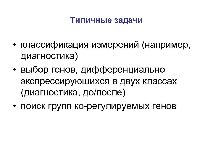 Типичные задачи • классификация измерений (например, диагностика) • выбор генов, дифференциально экспрессирующихся в двух классах (диагностика, до/после) • поиск групп ко-регулируемых генов