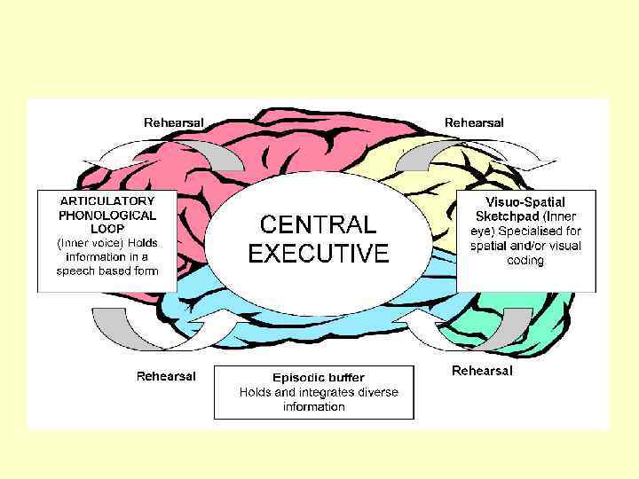 Зрительно-пространственный «блокнот» Visuo-spatial sketchpad Выделяют зрительный (форма, цвет и проч. , visual cache), пространственный (расположение объектов в пространстве) и кинестетический (двигательный) компоненты (inner scribe, внутренняя разметка).