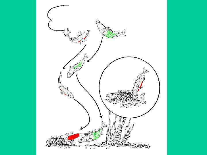 6 4 5 1 7 8 3 4 2 1 - самец принял угрожающую позу (демонстрирует ярко окрашенное брюшко); 2 - ищет место для гнезда; 3 - клейкой жидкостью скрепляет гнездо и делает туннель; 4 - зигзагообразный танец около самки, касаясь шипами брюшка; 5 - как только самка проникла в гнездо, самец начинает тыкать головой в основание брюшка, чем побуждает ее метать икру; 6 самка откладывает икру; 7 - отложив икру, самка выскальзывает из гнезда, а самец оплодотворяет икру; 8 - самец охраняет потомство (окраска нейтральная) (По Тинбергену, 1969)