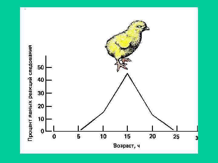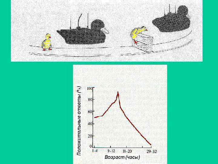 а. В первый период жизни любая достаточно большая тень вызывает у птенца реакцию затаивания; б. Происходит угашение реакции затаивания на те стимулы которые появляются часто; в. Стимул - силуэт хищника, не приводит к угашению реакции затаивания в силу того, что появляется редко.