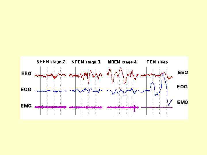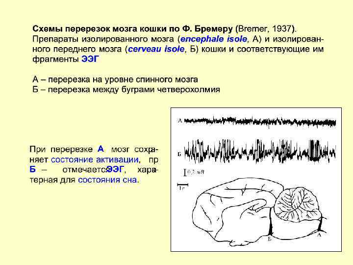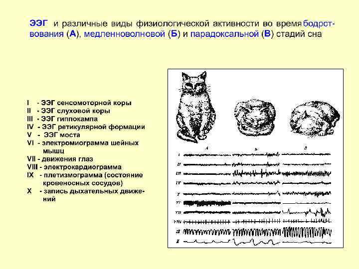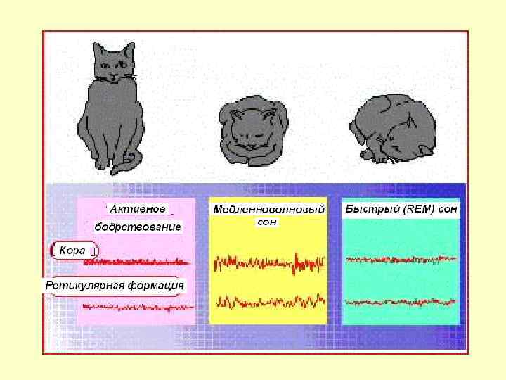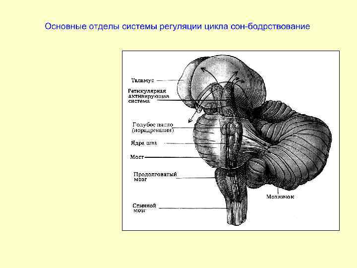 Бодрствование голубое пятно мышечный тонус «быстрая» ЭЭГ ретикулярная формация ядра шва движения глаз Медленноволновая стадия сна голубое пятно мышечный тонус «быстрая» ЭЭГ ретикулярная формация ядра шва движения глаз Парадоксальная стадия сна голубое пятно мышечный тонус «быстрая» ЭЭГ движения глаз ретикулярная формация ядра шва