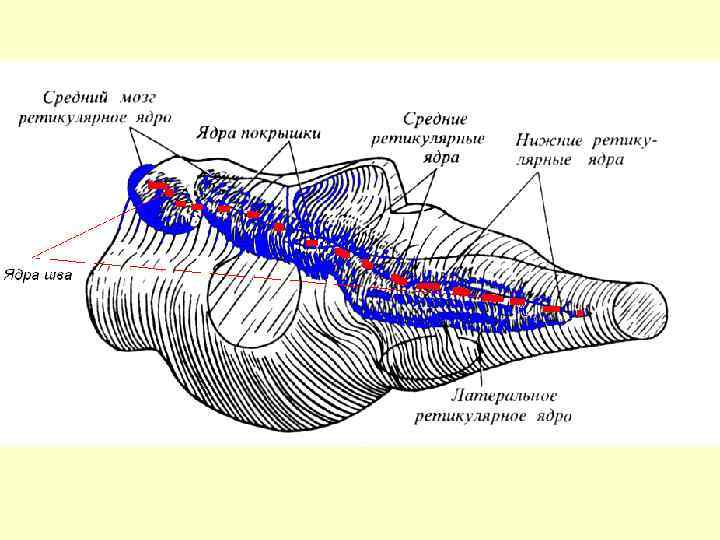 «Включение» бодрствования Схема расположения ядер восходящей системы неспецифической активации ( «центров бодрствования» ), обеспечивающих поддержание активного состояния мозга • • ДЛЯП - дорзо-латеральное ядро покрышки, ППЯ - педункуло-понтийное ядро, ГП - голубое пятно, ДЯШ - дорзальные ядра шва, ТМЯ - туберо-мамиллярные ядра, ВЛПО - вентро-латеральное преоптическое ядро гипоталамуса. В скобках указаны медиаторы, выделяемые нейронами данных ядер: Ац. Х – ацетилхолин, НА норадреналин, Сер – серотонин, Гист – гистамин, ГАМК – гаммааминомасляная кислота, Гал – пептид галанин/ (с модификациями по Saper et al. , 2001).