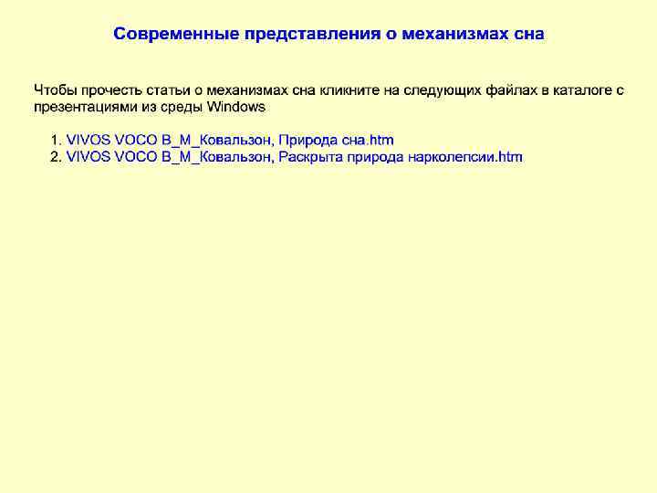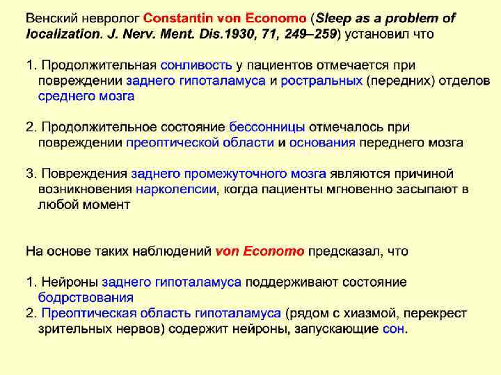 «Выключение» бодрствования (быстроволновый сон) Б – проекции орексин-содержащих нейронов латеральной области гипоталамуса. • • • ЛОГ - латеральная область гипоталамуса, БЯ – базальные ядра. В скобках указаны медиаторы, выделяемые нейронами ядер: Оре – пептид орексин. (с модификациями по Saper et al. , 2001).