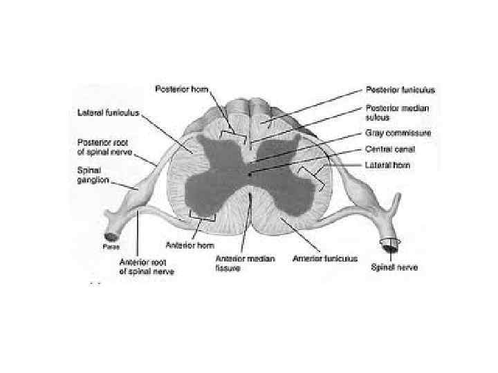 На поперечному перерізі видно сіру і білу речовини Сіра речовина: • Передні роги • Задні роги • Бічні роги • Проміжна зона • Комісури • Центральний канал