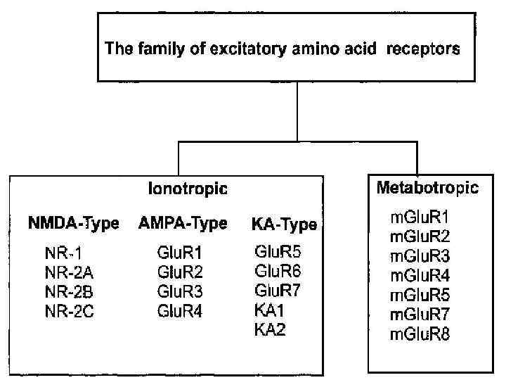 v AMPA-рецепторы (Рецепторы альфаамино-3 -гидрокси-5 -метил-4 изоксазолпропионовой кислоты) – активируемые глутаматом ионотропные рецепторы, опосредуют быструю возбуждающую синаптическую трансмиссию, участвуют в обучении и памяти. Активируют Na и Кканалы.