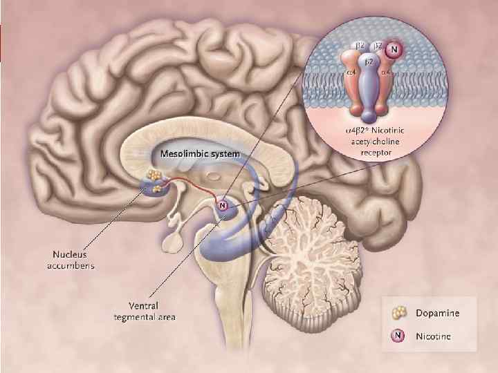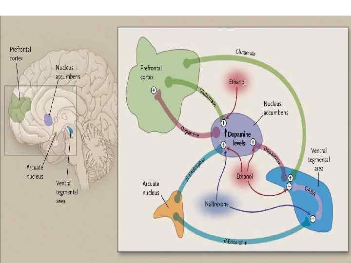Влияние на дофаминовую систему. v Алкоголь способствует усилению выделения дофамина в мезолимбической системе (от вентральной тегментальной области к прилежащему ядру – nucleus accumbens), обеспечивая стимуляцию моторики и позитивное подкрепление приёма алкоголя.