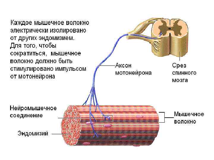 Волокна скелетной мускулатуры сокращаются под воздействием импульсов, поступающих от двигательных нейронов. Место, где моторный нейрон воздействует на мышечное волокно, называется нейромышечным соединением.