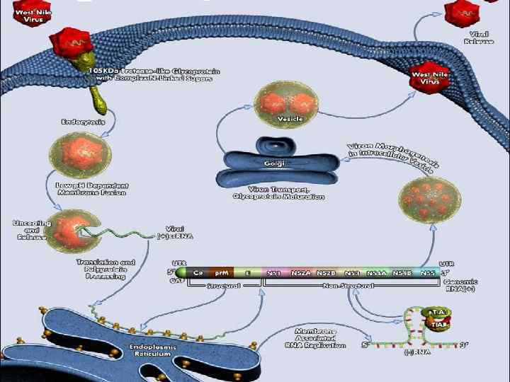 Репликативный цикл(продолжение) n n n Затем происходит раздевание нуклеокапсида и освобождение геномной РНК в цитоплазме. Далее следуют сложные совмещенные стадии трансляции и процессинга полипротеина (синтеза структурных и неструктурных вирусных белков) с ассоциированной с мембраной репликацией – размножением (+)- и (–)-цепей новой вирусной РНК. После чего вновь синтезированная (+)-цепь вирусной РНК комплексуется с M и С-белками в вирусный нуклеокапсид. Дальнейшая сборка вириона с участием поверхностного Е белка и созревание полного инфекционного вируса происходят в клеточных структурах и окончательно завершаются в процессе транспортировки вирусов через клеточную мембрану. Вирионы созревают по мере передвижения из шероховатого эндоплазматического ретикулума в гладкий, затем в аппарат Гольджи и, наконец, в плазматическую мембрану клетки.