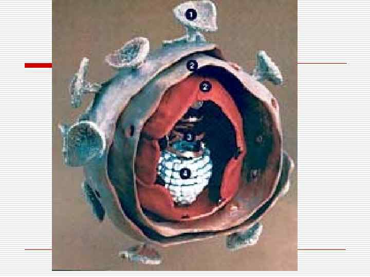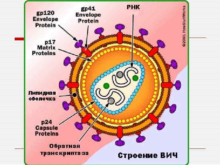 Вирусные заболевания человека. Профилактика и лечение Чума 21 века: ВИЧ/СПИД Строение ВИЧ (схема) 1 - мембрана вируса - это мембрана клетки человека; 2 - оболочечный белок gp 120; 3 - трансмембранный компонент оболочечного белка gp 41; 4 - матриксный белок (р17); 5 - оболочка нуклеоида (р24); 6 - геном ВИЧ - две молекулы одноцепочечной РНК Ферменты ВИЧ: 7 - обратная транскриптаза (RT); 8 - интеграза и РНКаза Н; 9 - протеаза Источник ВИЧ-инфекции — зараженный человек, находящийся в любой стадии болезни, в том числе и в периоде инкубации.