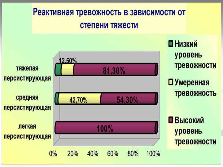 Реактивная тревожность в зависимости от длительности БА 62. 50% 37. 50% 12. 50% низкий уровень 69. 60% реактивной тревоги 62. 50% умеренный уровень 30. 40% реактивной тревоги 37. 50% 13% 11. 80% 0% высокий уровень 0% реактивной тревоги стаж до 5 лет от 5 до 10 лет от 10 до 20 лет и более