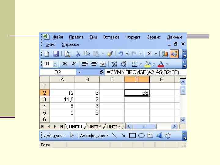 Скалярное произведение двух векторов. Скалярным произведением двух векторов одинаковой длины n называется сумма парных произведений соответствующих компонентов вектора. n Для этой операции можно использовать встроенную функцию СУММПРОИЗВ.