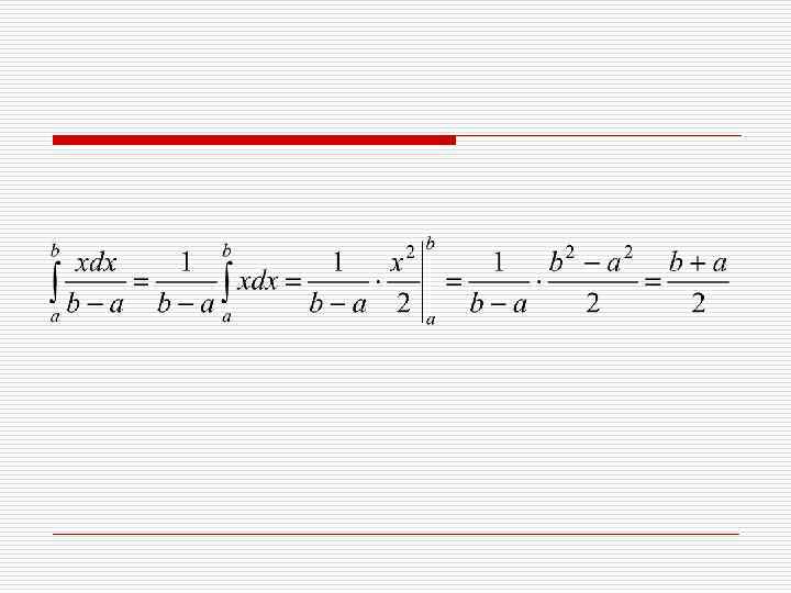 Математическое ожидание случайной величины Х , имеющей равномерное распределение на участке (a, b), получаем, вычисляя интеграл: т. е. математическое ожидание равно абсциссе середины участка (a, b).