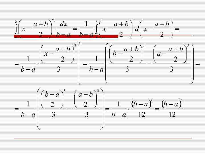 Дисперсию случайной величины, имеющей равномерное распределение на участке (a, b), находим, вычисляя интеграл: