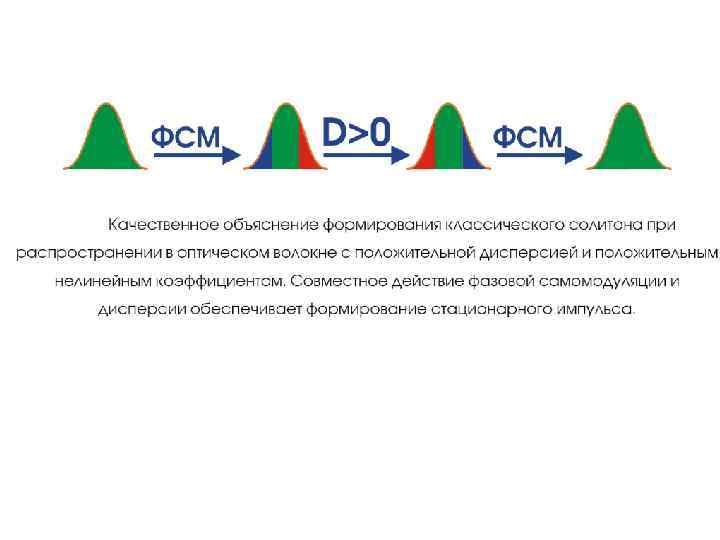 • В 1971 г. русские ученые Захаров и Шабат теоретически доказали существование солитонов в нелинейных дисперсных средах, решив уравнение Шредингера, описывающее распространение электромагнитной волны в такой среде. • В 1973 г. американские исследователи Хасегава и Тапперт заявили о возможности использования солитонных волн в оптоволокне, а в 1980 г. коллектив исследователей Bell Laboratories во главе с Молленауэром подтвердил это экспериментальным путем. • «Оптические солитоны» - это волны (или волновые пакеты) специальной формы, возбуждаемые лазерным источником света в световоде при совместном действии дисперсионных и нелинейных эффектов в области аномальной дисперсии. Солитоны могут распространяться в оптоволокне на значительные расстояния (несколько тысяч километров) практически без искажения формы и сохраняться при столкновениях друг с другом (т. е. восстанавливать направление движения, скорость и амплитуду, демонстрируя свойства, характерные для частиц).