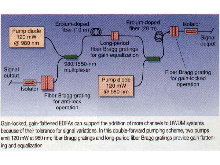 • 1. Усилители на Er 3+ легированном волокне Накачка 980 нм (c Yb) или 1480 нм, а усиление 1525 – 1565 нм: одна накачка обеспечивает усиление всех каналов, работающих в области 1525 – 1565 нм Ga. As