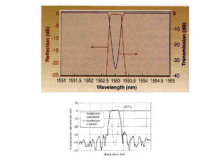Демультиплексоры/мультиплексоры на основе дифракции – решётка Брэгга Последовательность полуотражающих параллельных пластин (зеркал), расположенных на расстоянии d. Если Ein состоит из набора различных длин волн, то для некоторых l будет создано условие отражения (l. R = - 2 d/n, где n = +/- 1, +/-2, …). А остальные длины волн выйдут справа. Решётка Брэгга – полосовой фильтр. Fiber Bragg Grating (FBG) – состоит из отрезка оптического волокна, показатель преломления которого периодически изменяется по длине волокна. Метод изготовления – германий-силикатная сердцевина волокна облучается УФ через шаблон с период прозрачности, равным периоду изготавливаемой решётки и в сердцевине образуются оптические дефекты, приводящие к изменению показателя преломления
