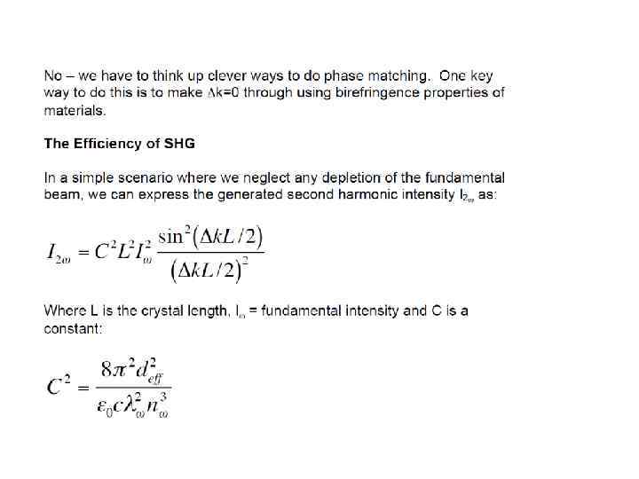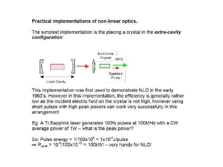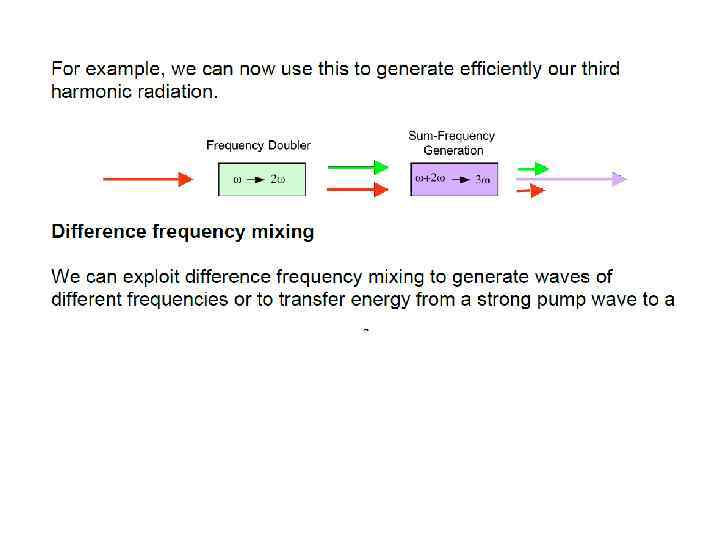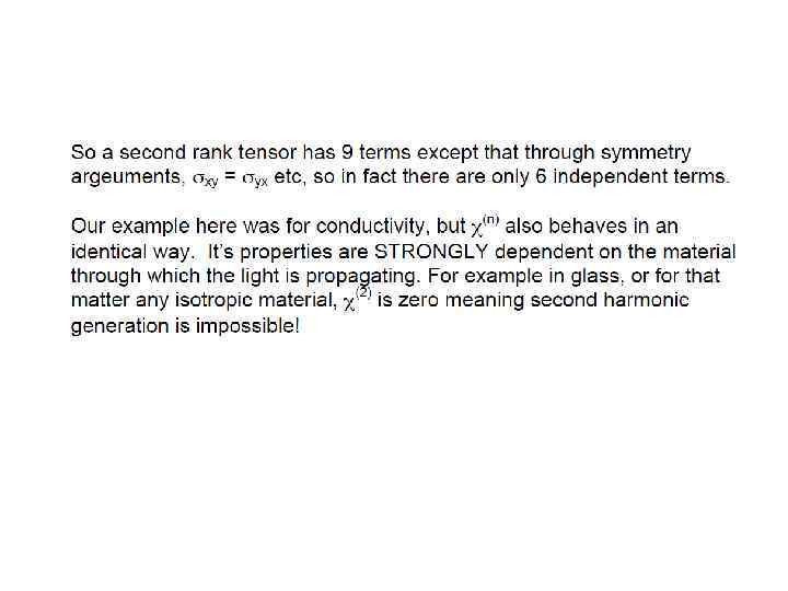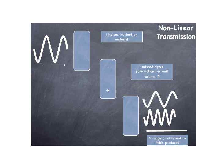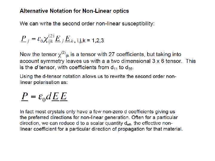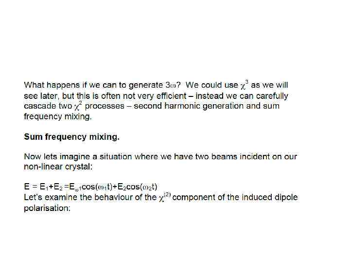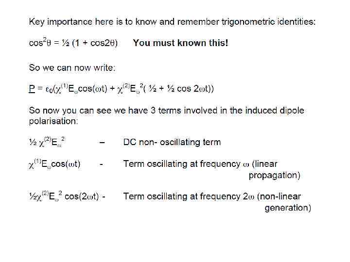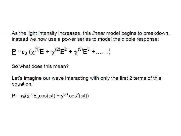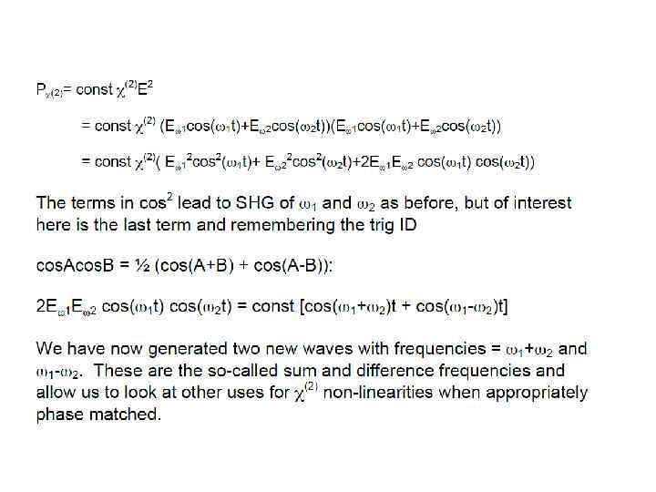 E(t) = Eωcos(ωt) into the expression for P gave rise to a number of terms: Ѕ χ(2)Eω 2 – DC non- oscillating term χ(1)Eωcos(ωt) - Term oscillating at frequency ω (linear propagation) Ѕχ(2)Eω 2 cos(2ωt) - Term oscillating at frequency 2ω (non-linear generation)