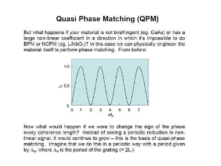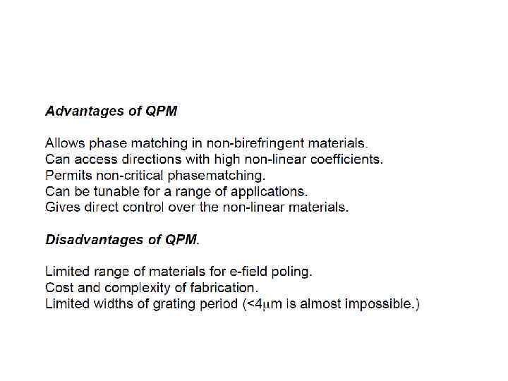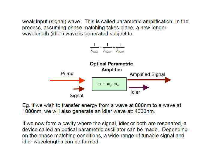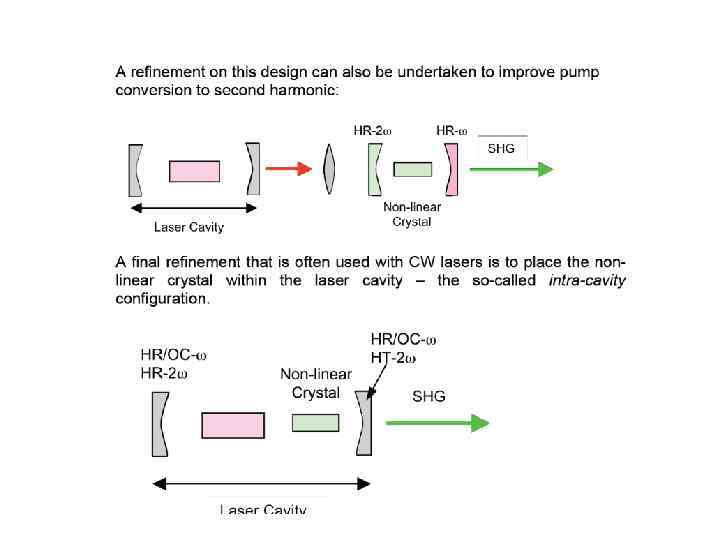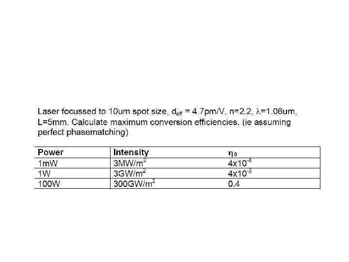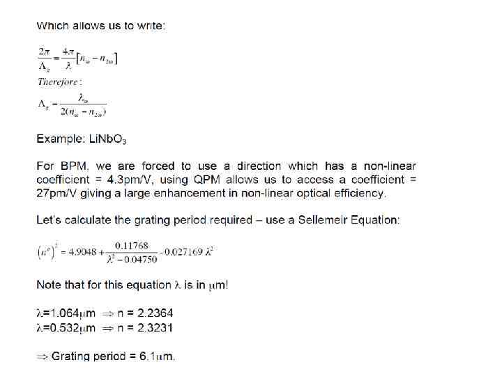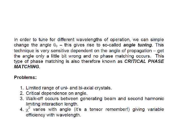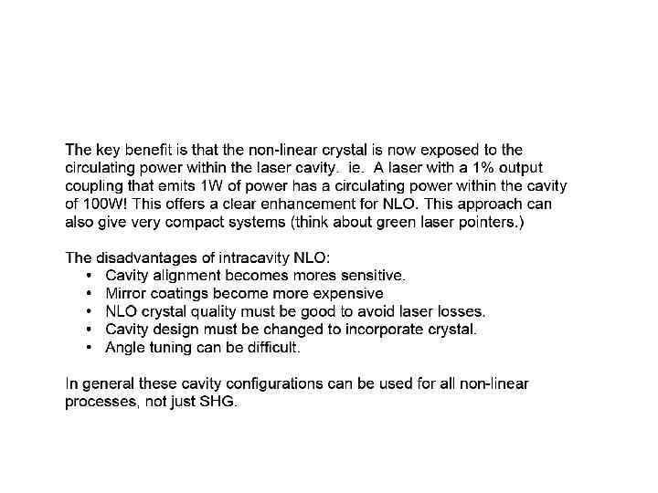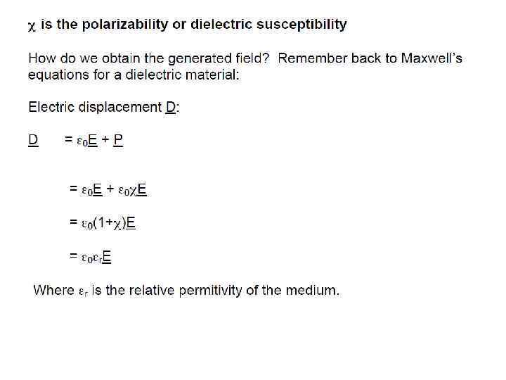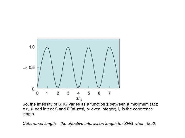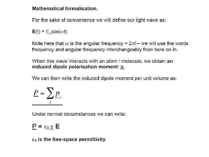E(t) = Eωcos(ωt) into the expression for P gave rise to a number of terms: Ѕ χ(2)Eω 2 – DC non- oscillating term χ(1)Eωcos(ωt) - Term oscillating at frequency ω (linear propagation) Ѕχ(2)Eω 2 cos(2ωt) - Term oscillating at frequency 2ω (non-linear generation)