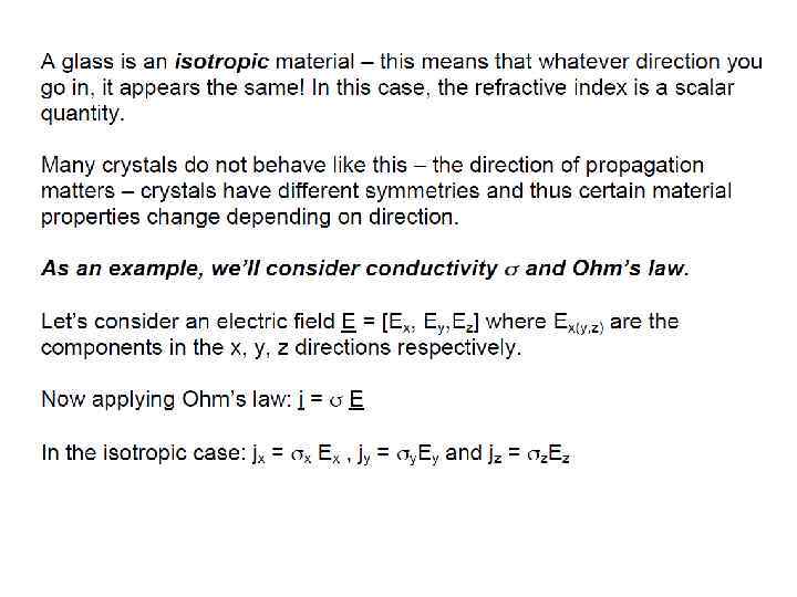 Remember also that χ(2) is a tensor and that the value changes depending of the direction of propagation in the material. In isotropic (iso – the same, tropic - in space) materials (eg. glasses, liquids etc) χ(2) = 0 throughout the material so second harmonic generation is impossible. In the case of anisotropic materials this is not the case and the χ(2) tensor has some non-zero elements resulting in second harmonic generation.