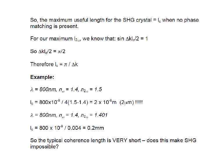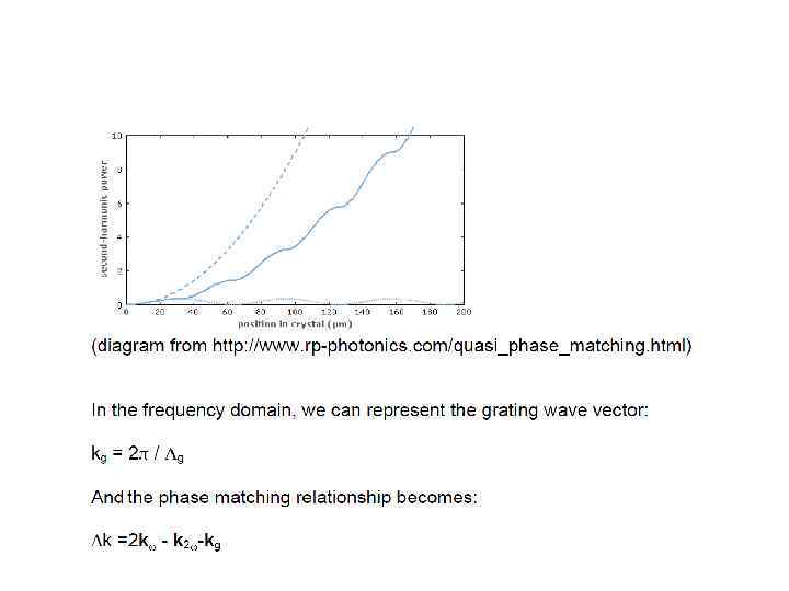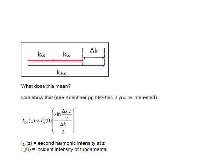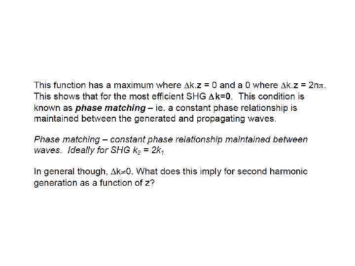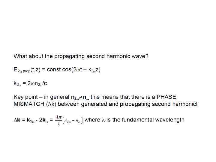 Now we need to consider how the second harmonic radiation is generated as we travel along the length of our crystal. Now let’s rewrite our wave propagating in the +z direction: E(t, z) = Eωcos(ωt-kωz) Can easily show that the second harmonic wave will have the form: E 2ω gen (t, z) = const cos(2ωt – 2 kωz) Where kω is the absolute value wave propagation vector: kω= 2πnω / λ (nω is the refractive index, n(ω)) kω = ωnω / c (c is the speed of light in a vacuum)