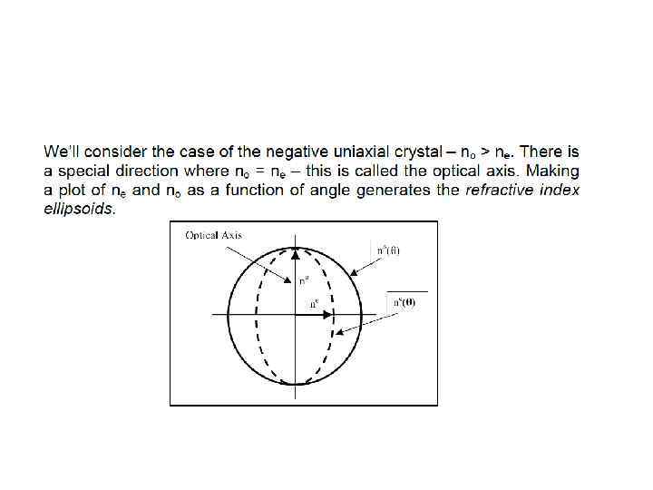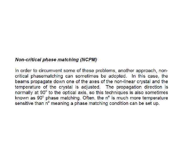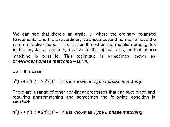 Phase Matching was of key importance for non-linear optics. Remember that phase matching occurs when a constant phase relationship is maintained between the generated and propagating waves. In general, this does not occur, so a repeated build up and decline of radiation is observed with a characteristic length given by the coherence length l 0. In order to make phase matching occur, we need to arrange a circumstance where n 2ω =nω. In order to do this we can use birefringent materials. Birefringence is a property of certain materials where different polarisations have different refractive indicies. You may be familiar with the c oncept of double refraction in calcite – this is an example of birefringence where the two rays formed have different polarisations – these are the ordinary, o-ray and the extraordinary, e-ray.