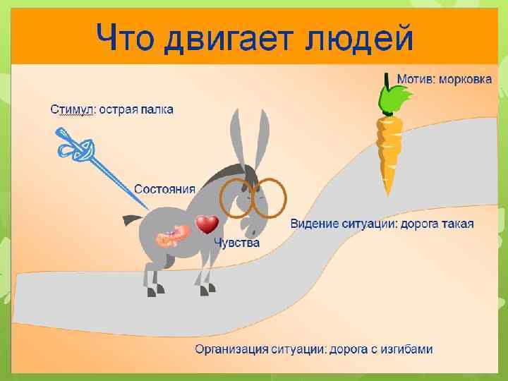 Мотивационный процесс 6 стадий Возникн овение потребн ости Поиск путей устранен ия потребно сти Определе ние направле ния действий Осущест вление действий Вознаг ражде ние Устране ние потребн ости • Что заставляет нас действовать? • В каком случае мы получаем удовольствие от деятельности?