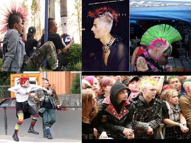 Панки - этолюди с огромными цветными ирокезами, с серьгами во всех частях тела, в изодранной во всевозможных местах одежде. Среди них большое количество девушек. Абсолютно не заботясь о привлекательности они бреются наголо, ставят ирокезы, навешивают на лицо килограммы "железа" и красят в черный цвет губы. Философия уличных панков, представленная наилучшим образом лозунгами партии немецкой парии панков APPD (Анархистская Пого-Партия Германии), состоит в том, что все общество подразделяется на три категории: одни (фанатики дисциплины и порядка, карьеристы и трудоголики) созданы для того, чтобы работать и зарабатывать деньги. Другие (панки, например) - для того, чтобы веселиться и эти деньги тратить. А третьих - жаждущих насилия нацистов и других преступников - следует сослать в одно место и изолировать, чтобы они друга уничтожили.