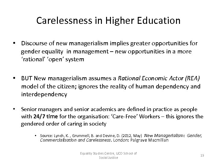 New managerialism – impact on equality in higher education • Efficiency is prioritised over equality of access, participation and outcome: Irish examples • Closure of the Higher Education Equality Unit as an independent entity; • No HEA surveys of Equality of access and participation for several years • No published data on the staff profile of those in higher education since 2004 (no data on gender, ethnicity, disability etc. , tenure status of staff) • Introduction of the HPAT – which was designed to discriminate against women at entry to medicine – no published data on this • Budget 2012 – Serious attack on Low Income students maintenance grants are removed for all graduate students; fees will only be paid for Masters students whose families have a net income of € 22, 703 • Silence from the IRISH UNIVERSITIES! Equality Studies Centre, UCD School of Social Justice 12
