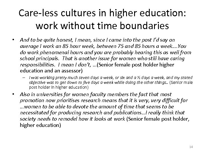 Care-less cultures in higher education: work without time boundaries • And to be quite honest, I mean, since I came into the post I’d say on average I work an 85 hour week, between 75 and 85 hours a week…. You do work phenomenal hours and you are probably hearing this as well from school principals. That is another issue for women who still have caring responsibilities. I mean I don’t, …(Senior female post holder higher education and an assessor) – I was working pretty much seven days a week, or six and a ½ days a week, and my stated objective was to get down to five days a week while doing the other things. . (Senior male post holder in higher education) • Also in universities for women faculty members the fact that most promotion now prioritises research means that it is very, very difficult for …women to be able to devote the amount of time that seems to be necessitated for producing research and publications…I really think that society needs to remodel how it looks at work (Senior female post holder, higher education) 14