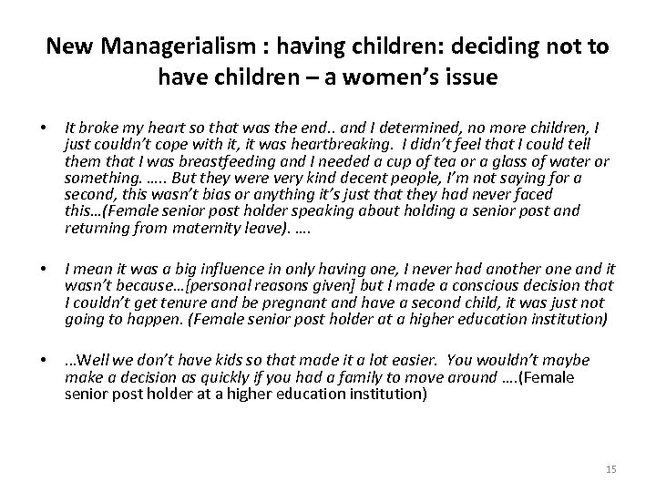 New Managerialism : having children: deciding not to have children – a women’s issue • It broke my heart so that was the end. . and I determined, no more children, I just couldn’t cope with it, it was heartbreaking. I didn’t feel that I could tell them that I was breastfeeding and I needed a cup of tea or a glass of water or something. …. . But they were very kind decent people, I’m not saying for a second, this wasn’t bias or anything it’s just that they had never faced this…(Female senior post holder speaking about holding a senior post and returning from maternity leave). …. • I mean it was a big influence in only having one, I never had another one and it wasn’t because…[personal reasons given] but I made a conscious decision that I couldn’t get tenure and be pregnant and have a second child, it was just not going to happen. (Female senior post holder at a higher education institution) • …Well we don’t have kids so that made it a lot easier. You wouldn’t maybe make a decision as quickly if you had a family to move around …. (Female senior post holder at a higher education institution) 15
