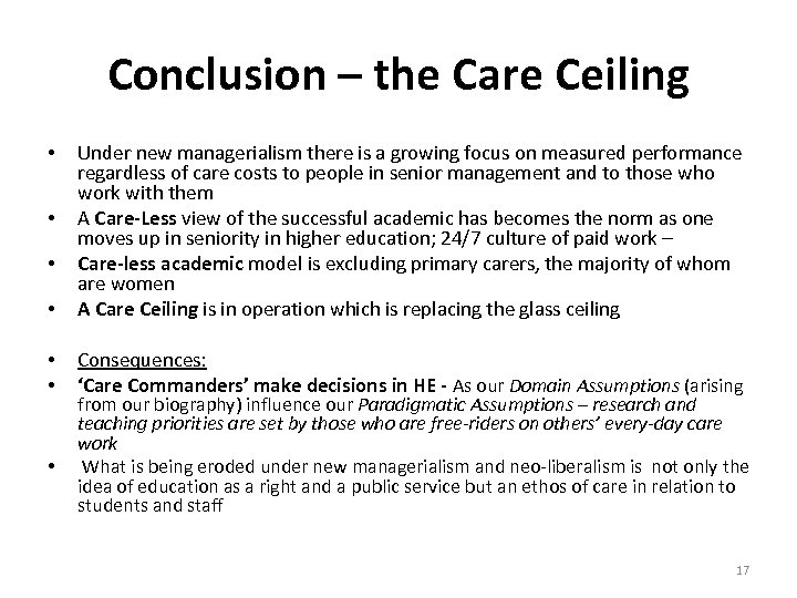 Management culture in higher education: Hiding care and facing the consequences Being the primary carer, parenting alone and hiding it • I didn’t find that very easy and I didn’t feel comfortable asking for any sort of accommodation to be made for it and indeed I didn’t ask for accommodation to be made for it. But there would have been times when it would have been nice to manage things like my son being ill or this kind of stuff because he was quite young. (Female senior post holder in higher education) Selection criteria that ignore care realities - for women • …It has tended to be very criteria-based and once you go criteria-based, you tend to get out of that [direct discrimination]. However, of course by the mere fact that you are looking for management experience in terms of criteria…you may in itself be limiting your field, …. . There are less women with that experience so you are by definition excluding them……In my optimistic days I think it is changing slightly, not hugely I think it is still very much a male -dominated society. . . (Female assessor for senior posts at a higher education institution). 16