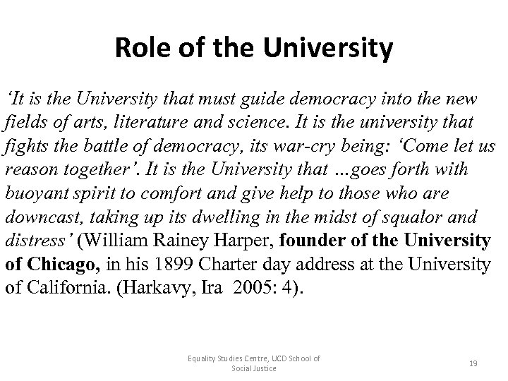 Role of the University ‘It is the University that must guide democracy into the new fields of arts, literature and science. It is the university that fights the battle of democracy, its war-cry being: ‘Come let us reason together’. It is the University that …goes forth with buoyant spirit to comfort and give help to those who are downcast, taking up its dwelling in the midst of squalor and distress’ (William Rainey Harper, founder of the University of Chicago, in his 1899 Charter day address at the University of California. (Harkavy, Ira 2005: 4). Equality Studies Centre, UCD School of Social Justice 19