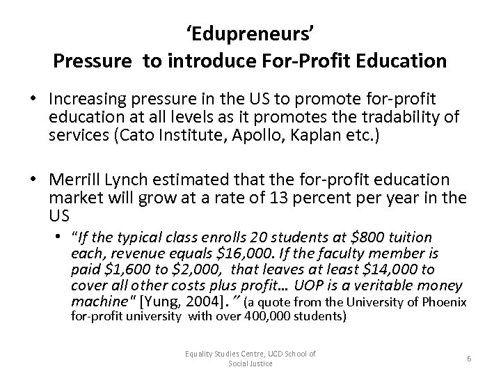 Global Capital defining the Role of the Universities • Global movement to make higher education a tradable service rather than a public service • Reason: Declining returns of capital from manufacturing, agriculture and other tradable activities – The Services Directive 2006 (EU) moving towards marketisation – General Agreement on Trade and Services (GATS)objective is the ‘liberalisation’ of trade in services – reduce state investment and placing lucrative areas of education (higher education) on the market – Outcomes: Once education services are defined as tradable under the GATS they are deregulated and legal, political and fiscal quality controls are greatly reduced. Equality Studies Centre, UCD School of Social Justice 5