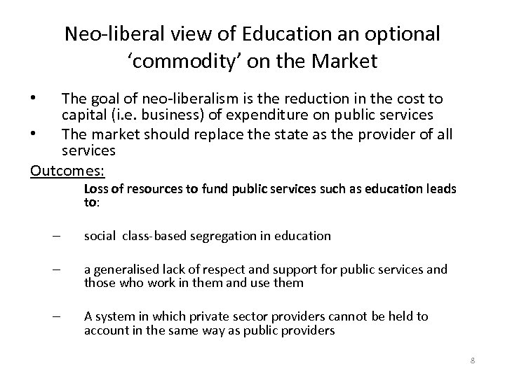 Neo-liberal view of Education an optional ‘commodity’ on the Market The goal of neo-liberalism is the reduction in the cost to capital (i. e. business) of expenditure on public services • The market should replace the state as the provider of all services Outcomes: • Loss of resources to fund public services such as education leads to: – social class-based segregation in education – a generalised lack of respect and support for public services and those who work in them and use them – A system in which private sector providers cannot be held to account in the same way as public providers 8