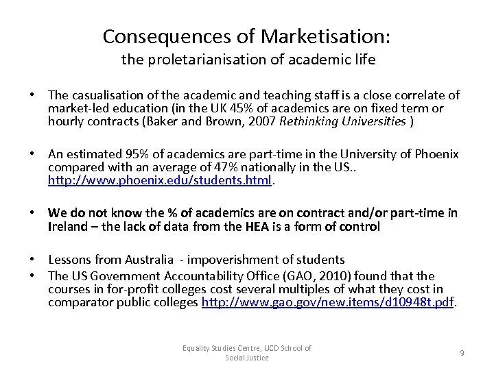 Consequences of Marketisation: the proletarianisation of academic life • The casualisation of the academic and teaching staff is a close correlate of market-led education (in the UK 45% of academics are on fixed term or hourly contracts (Baker and Brown, 2007 Rethinking Universities ) • An estimated 95% of academics are part-time in the University of Phoenix compared with an average of 47% nationally in the US. . http: //www. phoenix. edu/students. html. • We do not know the % of academics are on contract and/or part-time in Ireland – the lack of data from the HEA is a form of control • Lessons from Australia - impoverishment of students • The US Government Accountability Office (GAO, 2010) found that the courses in for-profit colleges cost several multiples of what they cost in comparator public colleges http: //www. gao. gov/new. items/d 10948 t. pdf. Equality Studies Centre, UCD School of Social Justice 9